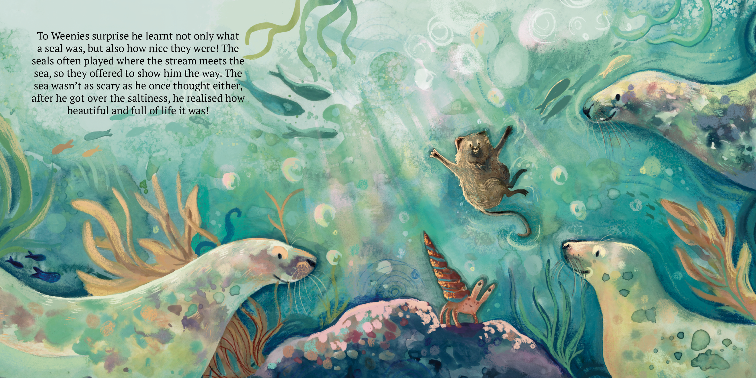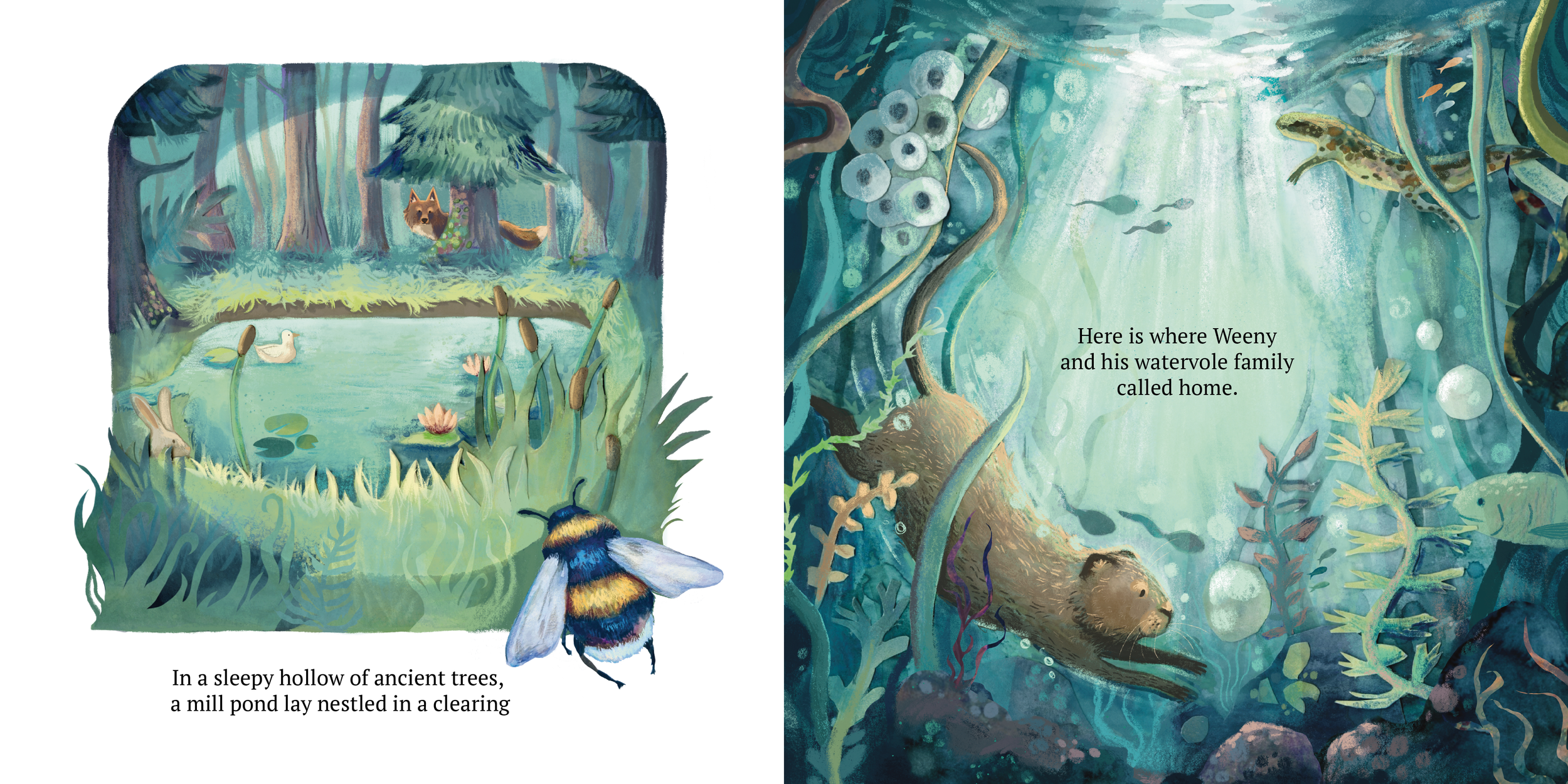 Weeny the Water-vole is a self initiated 40 page (16 spread) children’s story, I have written and begun to illustrate. The above portrays 4 finals (text mock up only), endpapers, some rough dummy pages and concept art. If you would like more informative on this project please contact me.
